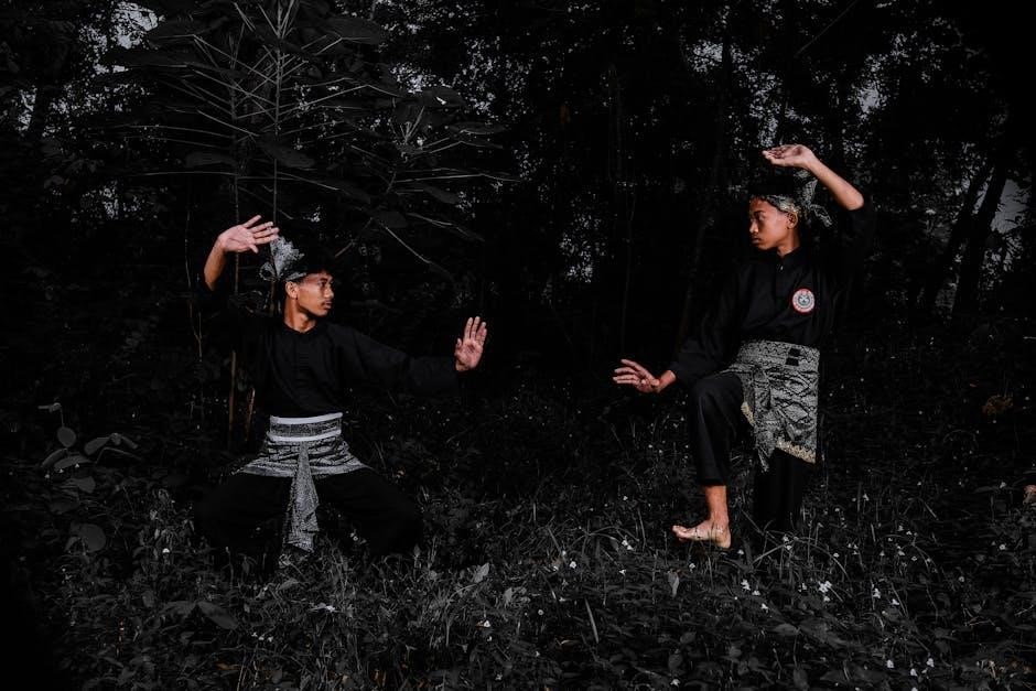 PDF materials often highlight the need for smooth, controlled movements, avoiding jerky or rushed execution. Practitioners are encouraged to visualize each technique and focus on precise form, enhancing both power and balance.